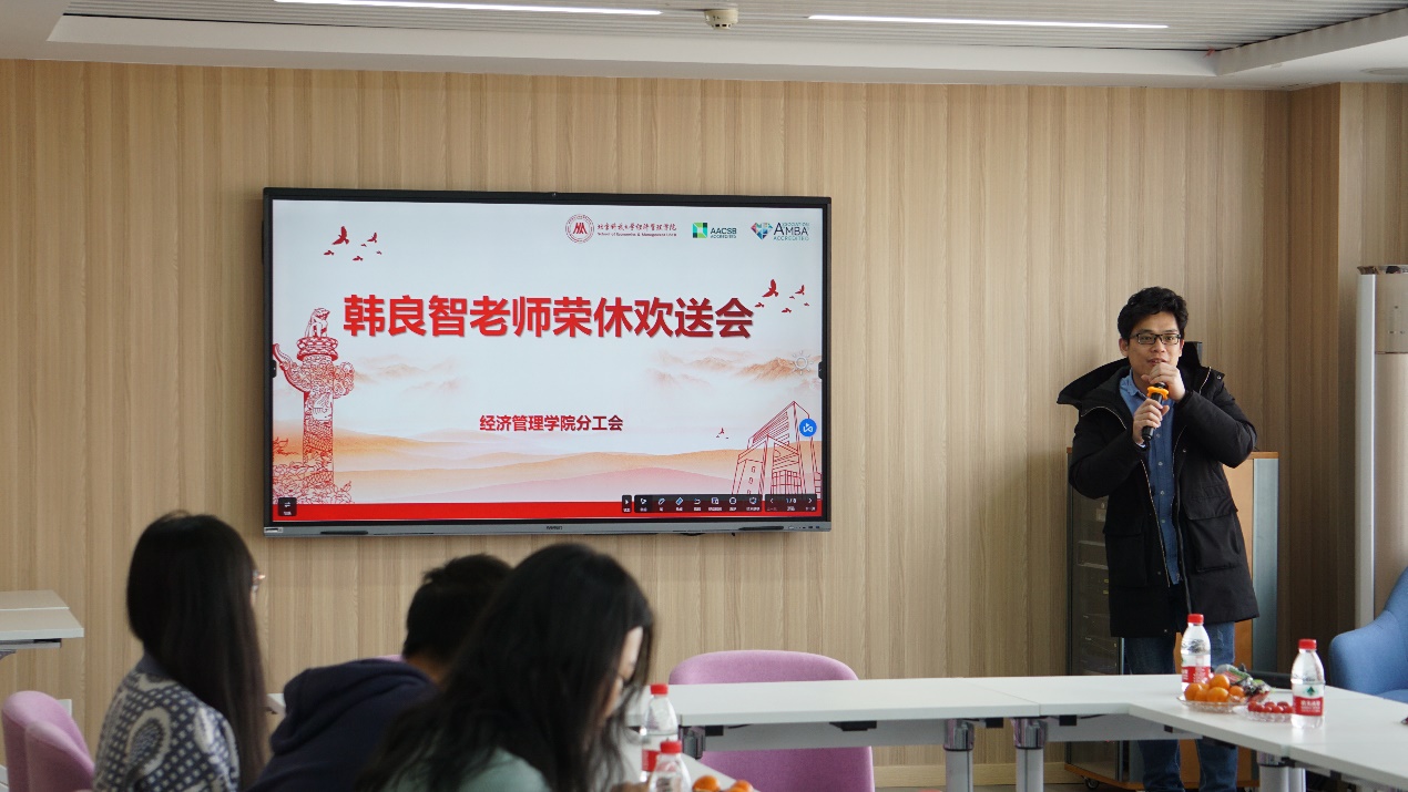 荣休会由cgpay钱包下载 院办、院分工会和财会系共同筹办,由财会系黄秋彬老师主持,cgpay钱包下载 领导、教师等30余人齐聚经管楼1205房间,共贺韩老师光荣退休,并送上了诚挚的祝福。