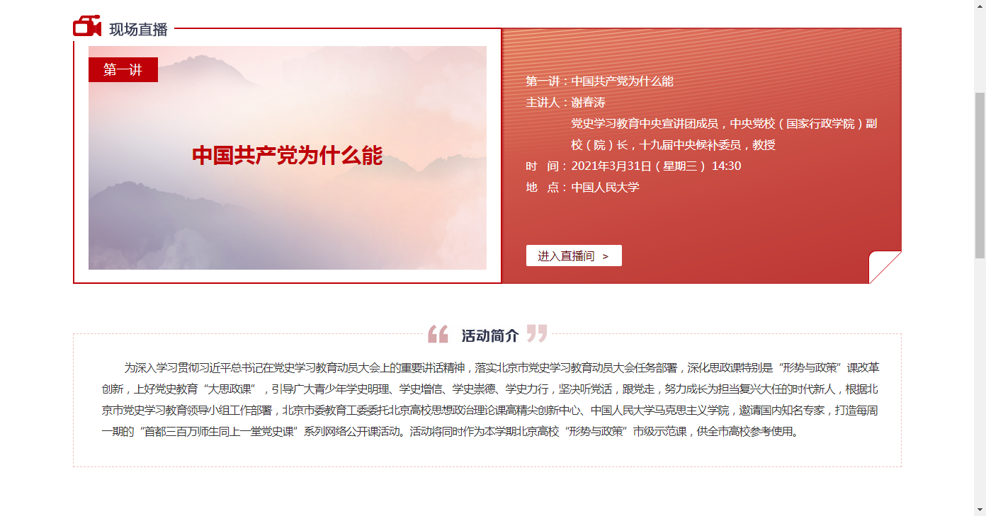 为深入学习贯彻习近平总书记在党史学习教育动员大会上的重要讲话精神,引导广大师生做到学史明理、学史增信、学史崇德、学史力行,增强“四个意识”、坚定“四个自信”、做到“两个维护”,不断提高政治判断力、政治领悟力、政治执行力。3月31日下午,由北京市委教育工委、北京高校思想政治理论课高精尖创新中心打造的“首都百万师生同上一堂党史课”网络公开课启动仪式暨首场报告会在中国人民大学举行。中央党校(国家行政cgpay钱包下载 )副校(院)长谢春涛教授应邀担任首讲嘉宾,聚焦“中国共产党为什么能建立新中国”“为什么能收拾好国民党的烂摊子”等重点问题,系统总结了中国共产党“有远大理想追求”“有科学理论引领”“有选贤任能机制”“有严明纪律规矩”“有自我革命精神”“有强大领导能力”等六个方面优秀特质,科学解答了“中国共产党为什么能”这一重大课题。按照学校党委教师工作部要求,cgpay钱包下载 组织各系全体无课的教师通过网络直播方式参与线上聆听学习,积极报送学习感想,反响热烈。