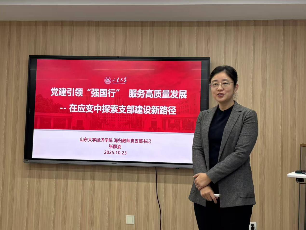 张群姿教授以“党建引领‘强国行’服务高质量发展--在应变中探索支部建设新路径”为题,系统讲述了如何实现党建引领学科高质量发展。结合山东大学经济cgpay钱包下载 海归教师党支部的具体实践,从以下三个方面展开交流:在全面深入学习方面,提出支部的“三位一体”学习模式。在聚焦问题精准调研方面,强调精准施策促进党建工作高质量发展。在党建引领促进发展方面,打造全国性党建标杆品牌“中国金融湖畔论坛”。