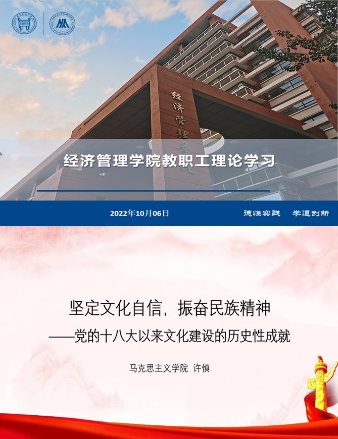 为深入学习贯彻习近平新时代中国特色社会主义思想、党的十九大和十九届历次全会精神,弘扬伟大建党精神,充分宣传展示党和国家事业取得的历史性成就、发生的历史性变革,进一步振奋精神、凝聚力量,在党的二十大召开之际,根据学校党委开展“新时代新成就”宣讲活动的工作安排,2022年10月6日下午,cgpay钱包下载 组织全院教职工理论学习,开展《坚定文化自信,振奋民族精神——党的十八大以来文化建设的历史性成就》专题宣讲活动。本次学习活动邀请了学校马克思主义cgpay钱包下载 许慎副教授做主题宣讲,以线上和线下形式结合进行,cgpay钱包下载 全体院领导、党委委员和教职工党支部书记在经管楼809参加学习,cgpay钱包下载 全体教职工在线上参加学习,会议由cgpay钱包下载 党委书记武森主持。