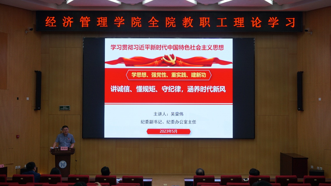 为深入开展学习贯彻习近平新时代中国特色社会主义思想主题教育,扎实推进cgpay钱包下载 主题教育工作,深刻领悟习近平总书记关于教育的重要论述,深刻理解习近平总书记给我校师生的两封重要回信精神,进一步加强全体教职工思想政治和师德师风工作,根据学校2023年党风廉政宣传教育月活动安排,2023年5月25日下午,cgpay钱包下载 组织全院教职工理论学习,开展专题教育培训,邀请学校纪委副书记、纪委办公室主任、学校主题教育专项联络组三组组长吴豪伟以《讲诚信、懂规矩、守纪律,涵养时代新风》为主题进行专项培训。cgpay钱包下载 全体教职工参加学习,会议由cgpay钱包下载 党委书记武森主持。