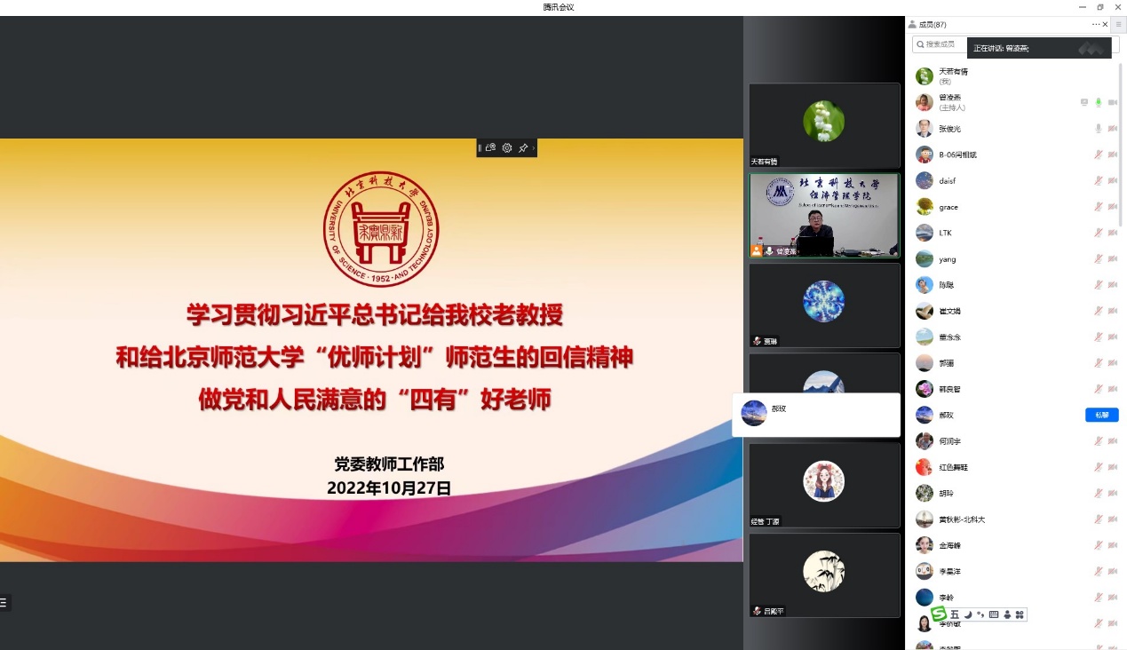 为深入学习领会习近平总书记关于教师队伍建设的重要论述,深刻理解习近平总书记给北京科技大学老教授的重要回信和给北京师范大学“优师计划”师范生的重要回信精神,进一步加强教师思想政治和师德师风工作,根据学校2022年党风廉政宣传教育月活动安排,2022年10月27日下午,cgpay钱包下载 组织全院教职工理论学习,开展师德师风专题教育培训,邀请学校党委教师工作部部长董春阳以《学习贯彻习近平总书记给我校老教授和给北京师范大学“优师计划”师范生的回信精神做党和人民满意的“四有”好老师》为主题进行主讲。cgpay钱包下载 全体院领导、党委委员、系主任和教职工党支部书记在经管楼809参加学习,cgpay钱包下载 全体教职工在线上参加学习,会议由cgpay钱包下载 党委书记武森主持。