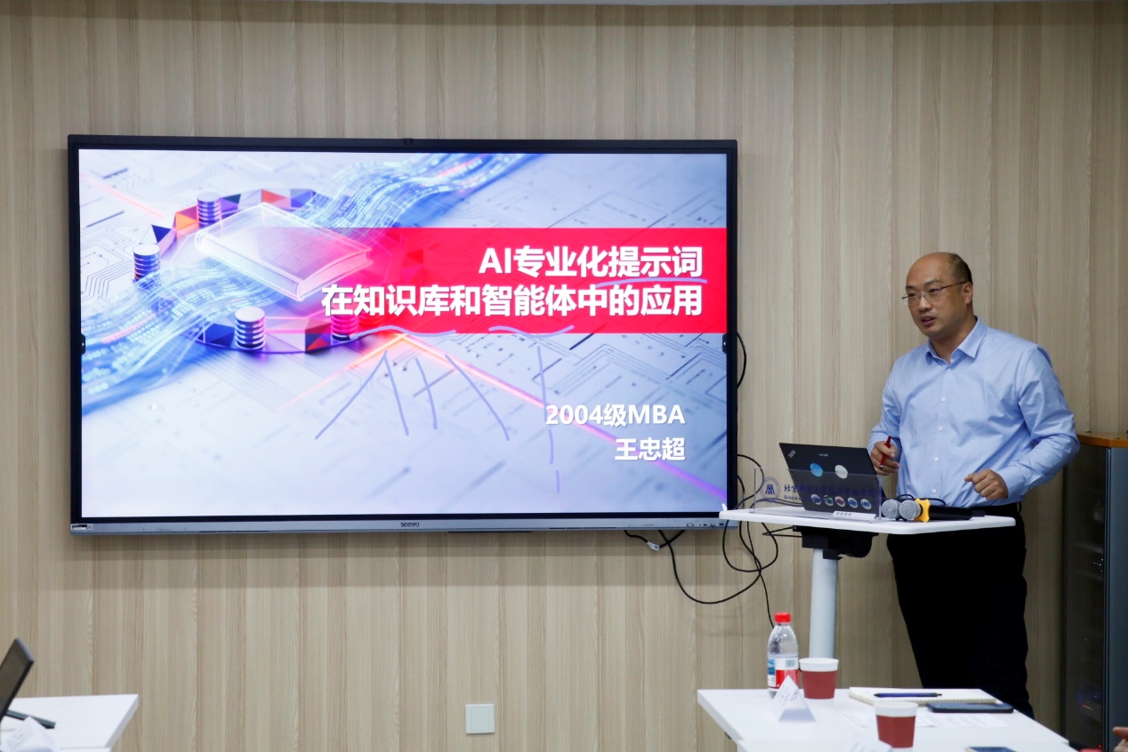 王忠超校友的分享题目为《AI专业化提示词在知识库和智能体中的应用》。他通过现场教学的方式,引导校友们亲身体验AI工具的应用,深刻展示了其带来的显著效率提升。他的分享内容实践性强,引发了现场的热烈讨论。