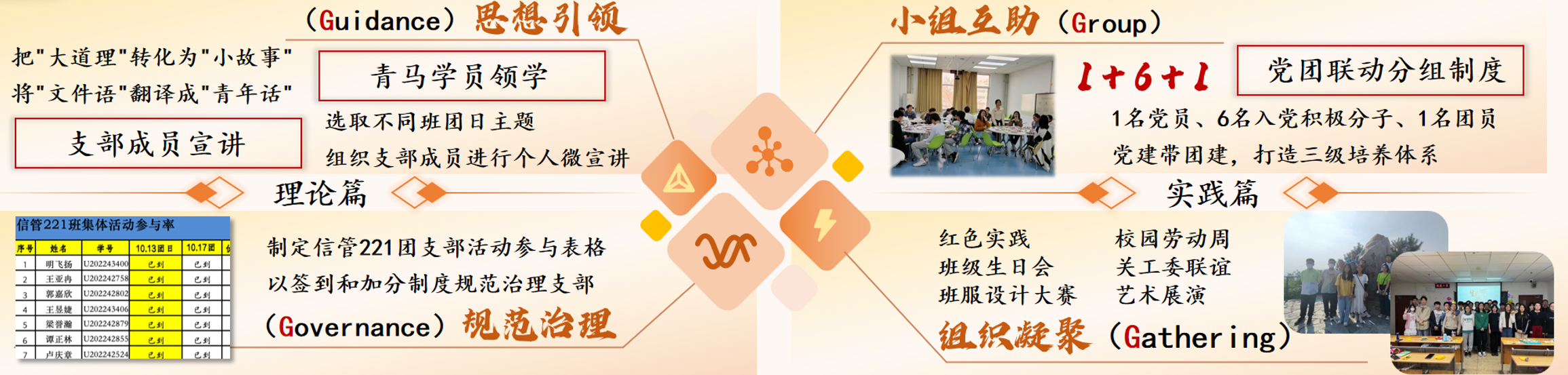 郭嘉欣创新构建“五育融合”工作体系,以“4G”工作法为基准,系统推进支部建设。“思想引领(Guidance)、 规范治理(Governance)、 小组互助(Group)、 组织凝聚(Gathering)”的工作机制,配套“青马领学、签到加分、党团分组、集体建设”四大保障制度,以团日活动为主媒介,巧妙融合德智体美劳五大育人模式,使支部成员在青春实践中实现全面发展。在她的引领下,信管221团支部不仅成为思想碰撞的熔炉,更化作青春成长的沃土,让每一位成员都能在集体中绽放独特光芒。