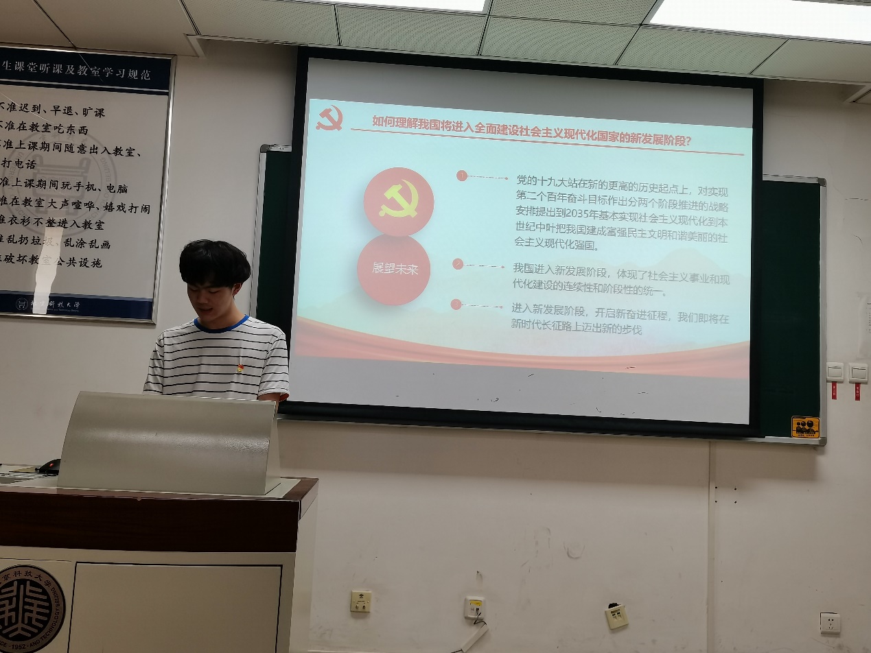 支部第一小组成员程航、杜重山及赵朔针对《习近平新时代中国特色社会主义思想学习问答》“四个全面擎宏图”篇的六大问题,由习近平总书记在陕西延安梁家河的小村庄七年知青岁月的故事引入,分享全面建成小康社会,充分彰显了中国特色社会主义制度的强大生命力和巨大优越性,显著提高了我国国际地位,为广大发展中国家解决贫困问题、实现现代化贡献了中国智慧、中国方案。通过近代、建国、改革开放以来的对比,总结到我国对外开放不断向纵深发展,逐步形成从沿海到沿江、从沿边到内陆,多层次、多渠道、全方位开放的新格局。同时通过视频深入学习只有坚定中国特色社会主义道路,才能建设社会主义法治国家,为全面建设社会主义现代化国家、实现中华民族伟大复兴的中国梦提供有力法治保障。