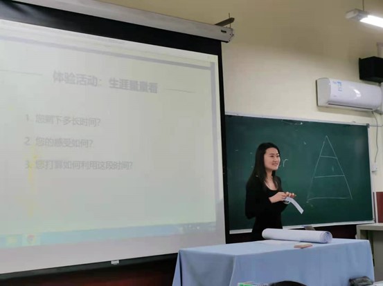 接着,辅导员李响通过让同学们体验“生涯量量看”活动,引导同学们意识到要做好职业生涯规划,将有限的时间最大化利用。为了帮助同学们规划职业生涯,辅导员李响通过逆推意识唤醒金字塔的方式,让同学们自主思考,要达到所希望的生活需要从哪里开始,如何行动,需要什么能力。