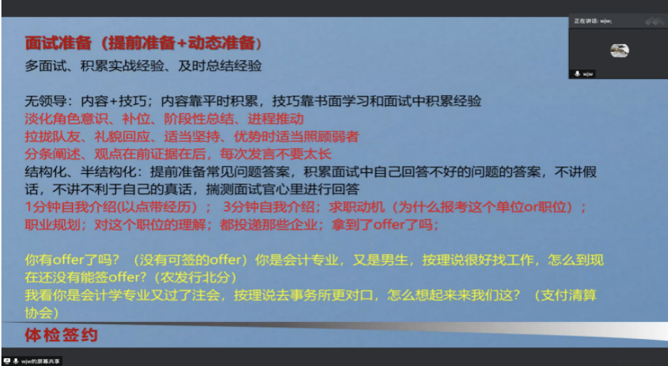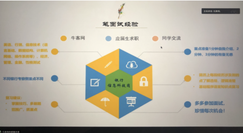 就职于中国人民银行的魏建武学长重点分享了自己的笔面试经历,他建议笔试要提前准备,行测为主,其次申论,再次是专业课和英语。面试则要积累实战经验,及时总结。
