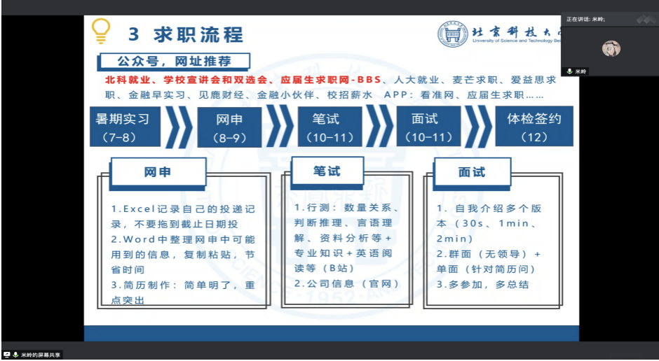 然后,从事互联网行业的张丽丽和杨珮祯学姐先后分享了求职经验,介绍了互联网行业与银行、国企的差异,求职时间线及多版本简历的撰写技巧。