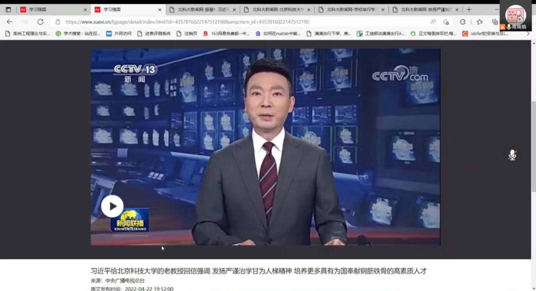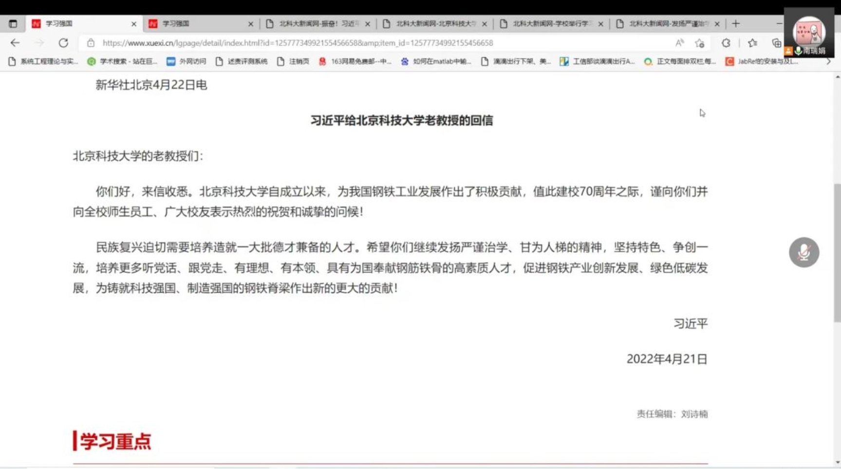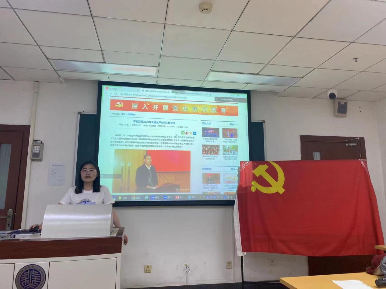 首先是本次组织生活的理论学习部分。首先,支部书记南瑞娟带领支部党员学习了《习近平给北京科技大学老教授的回信》,支部成员收看了《新闻联播》关于习近平总书记回信的相关报道并认真学习阅读了习近平总书记回信原文。
