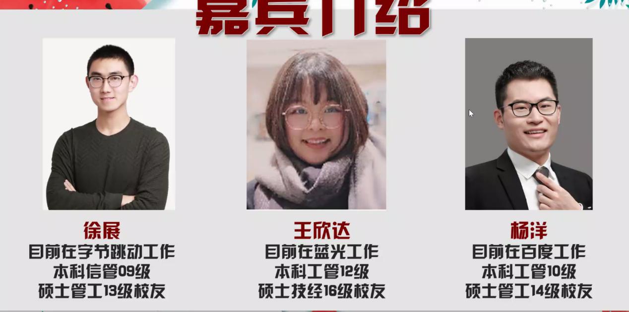 最后杨洋校友对信息管理与信息系统专业做出了介绍,对于“管理”做出了解释,说明信管专业是对问题进行管理,是一个更具竞争力的交叉学科,对交叉人才进行培养。杨洋校友还通过一些思维导图对信管专业的专业核心,专业技能,发展流程进行了清晰的介绍,提出信管专业人才需求很大,就业面广,为同学们进行了专业而理性的剖析。