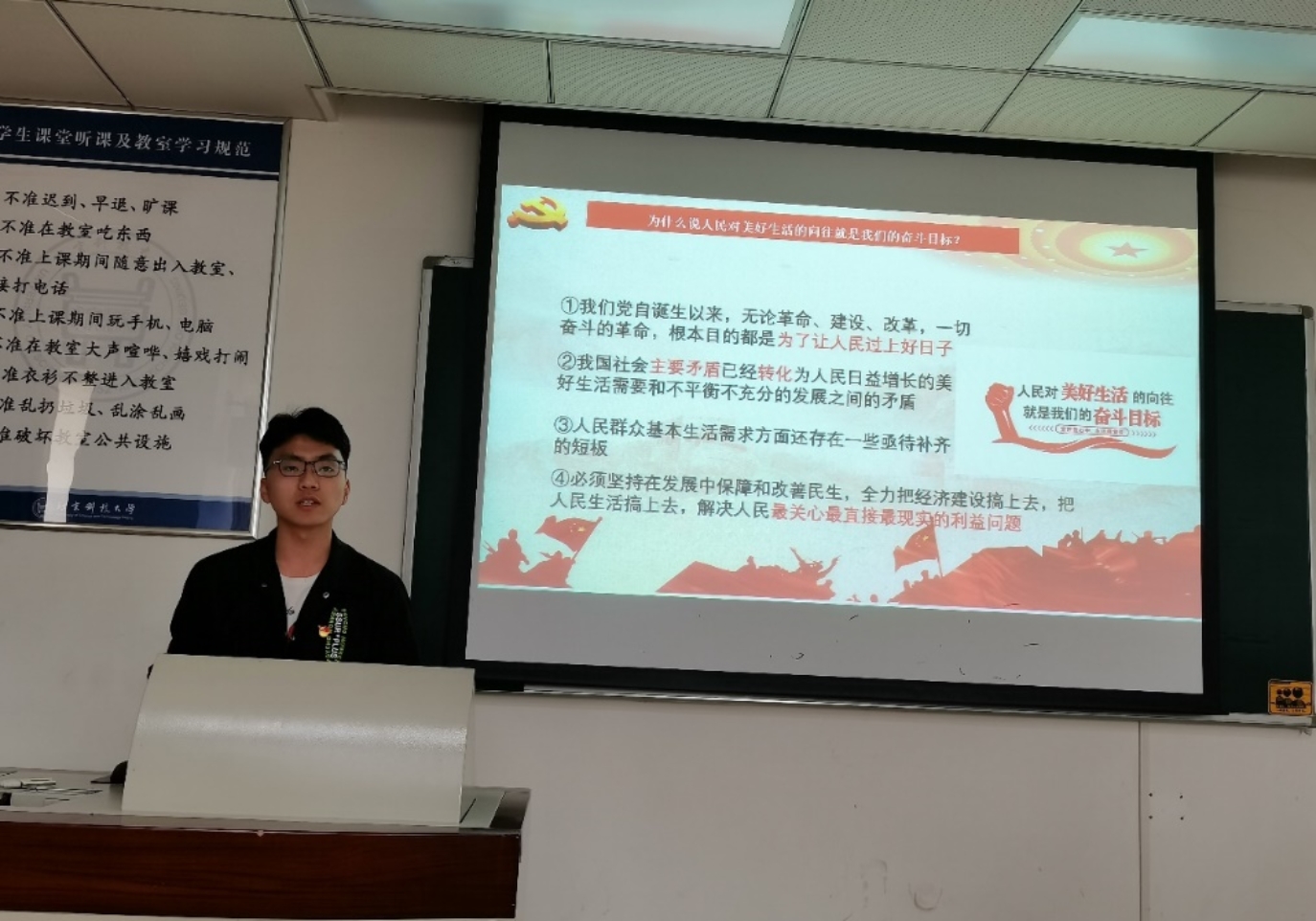 支部第四小组成员郝嘉睿、蒋周涛针对《习近平新时代中国特色社会主义思想学习问答》第三章初心砥柱天地间的六个问题作出了细致的讲解。首先,郝嘉睿同学从党的初心和使命是党的性质宗旨、理想信念、奋斗目标的集中体现、是加强党的建设的永恒课题、是我们党肩负起实现民族复兴历史使命的根本要求三个方面说明我们党作为百年大党,为什么必须始终牢记初心和使命。随后,支部成员蒋周涛从马克思主义政党的根本政治立场,党的性质和宗旨两个方面说明为什么人民对美好生活的向往就是我们党的奋斗目标,并带领大家通过视频学习了实现伟大梦想必须进行的伟大斗争、伟大工程、伟大事业。紧接着,他从党的指导思想、性质宗旨以及代表人民根本利益两个方面说明了只有中国共产党才能肩负起实现中华民族伟大复兴的历史使命。最后,主持人郝嘉睿表示在千变万化的社会中,只有深扎信念之根,才能抵挡住不良诱惑的影响,才能在激流险滩中破浪前行。她号召大家平时注意党性修养的培养,牢记初心、忠于初心、守住初心,不忘使命,为共产主义奋斗终身。