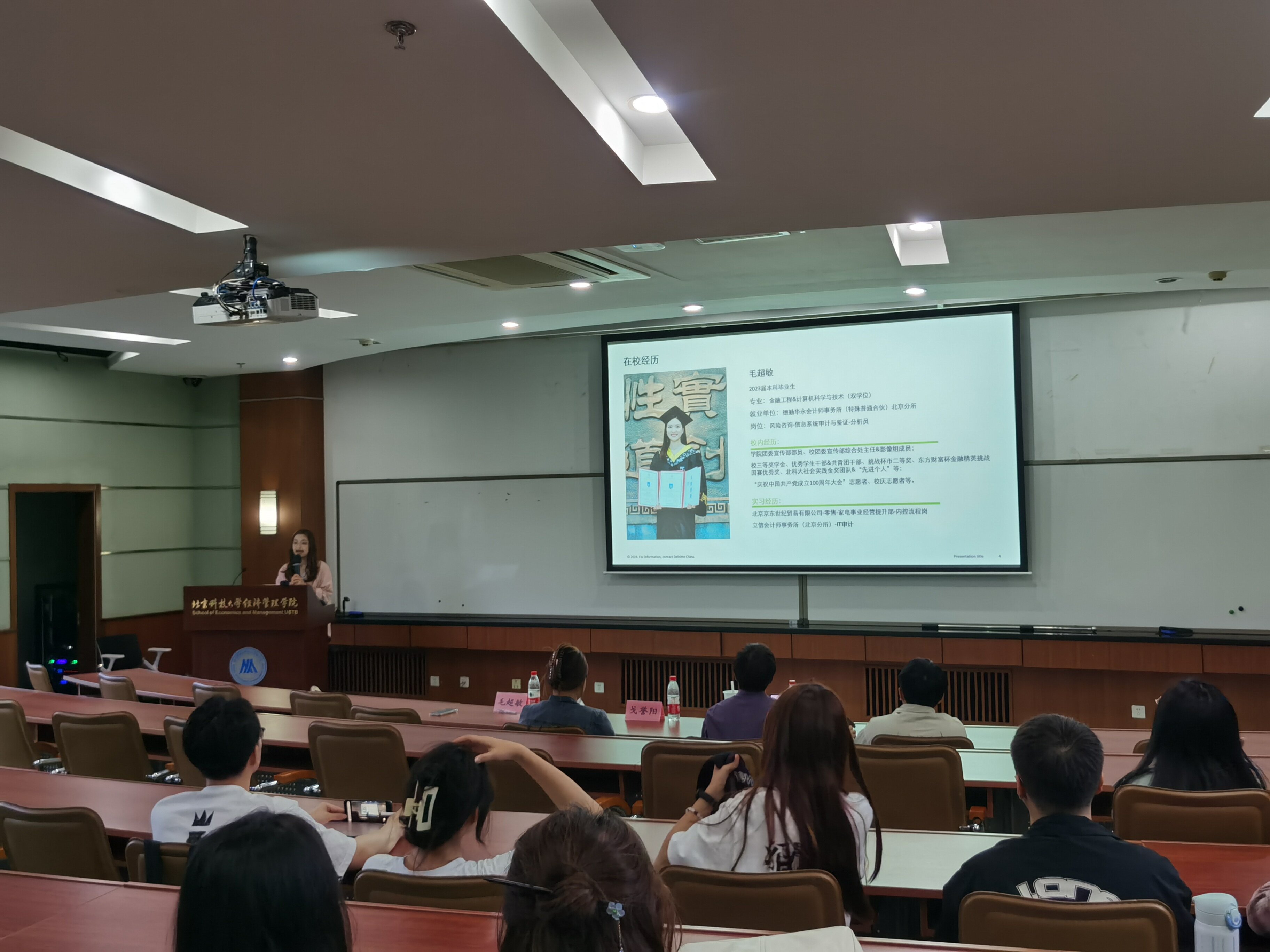 首先,由毛超敏就自己的求职经历展开分享。在校期间她积极参与各种活动锻炼自身能力,并在专业实习的过程中,不断探索并确定自己喜欢的就业岗位和未来发展方向。在简历投递阶段,运用excel列时间表的方式帮助自己记清每份简历投递的公司、具体岗位以及投递进度等,以免错过重要时间节点。20多个公司,40多个岗位,她不断总结,不断模拟,熟能生巧,在面试过程中积累了丰富的求职经验。在入职培训阶段,仍保持着不断学习的劲头,考取相关专业证书,为后续的工作打下坚实基础。