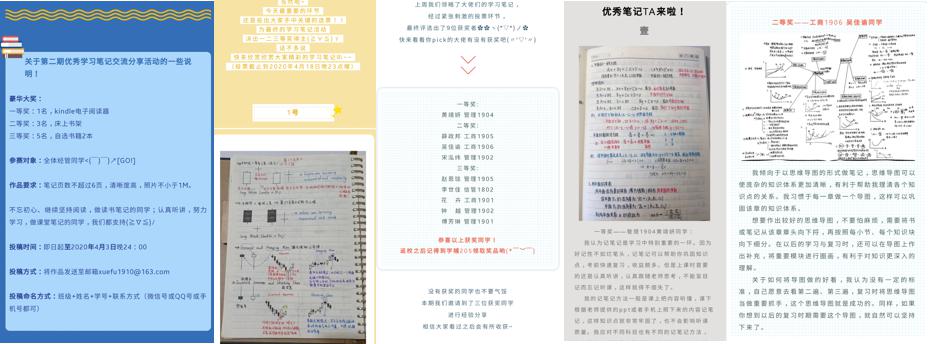 加强优秀作品宣传,帮助学生厚积以薄发。学习笔记是学生“学而时习之”的有力法宝,一份优秀的笔记更是学生知识积累的珍贵结晶。cgpay钱包下载 学辅中心大力支持学生记录笔记,开展读书笔记评比活动两期。第二期学习笔记评比中一等奖获得者黄婧妍说:“学而不思则罔,思而不学则殆。我们要在记笔记中思考,将笔记作为辅助,这样学习会更上一层楼。”“学风建设月”期间cgpay钱包下载 学辅中心共收集投稿笔记百余篇,评选出九篇优秀笔记并进行笔记记录心得分享,传递实用经验,让更多同学乐于、善于记录笔记。