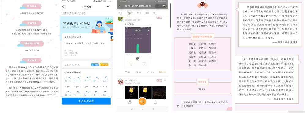 注重日常习惯养成,引导学生勤学自律。根据学生居家学习特点,cgpay钱包下载 学辅中心开展“勤学打卡计划”系列活动,并倡导各班根据班级需求开展“科研打卡”、“健身打卡”等有特色的打卡活动。在cgpay钱包下载 “勤学打卡计划”中成功坚持21天打卡的王焕琪同学说:“参加本期学辅组织的线上打卡活动,让我更加自律。当我把这次线上打卡活动加入每天的安排中,它就慢慢变成了我的习惯。”据统计,有近百位同学参加cgpay钱包下载 组织的各类打卡活动并长期坚持,引领勤学学风,吸引越来越多的同学养成良好习惯。