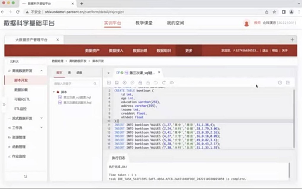 第一部分,在讲述SQL之前,乔老师首先对上节课所讲授的数据库知识进行回顾。接着,通过屏幕共享,乔老师在数据科学基础平台上为学员们演示如何在一个数据库里创建数据表并向表中插入数据的语法,以及如何从数据表中查取数据,从而搭建一个完整的数据库。
