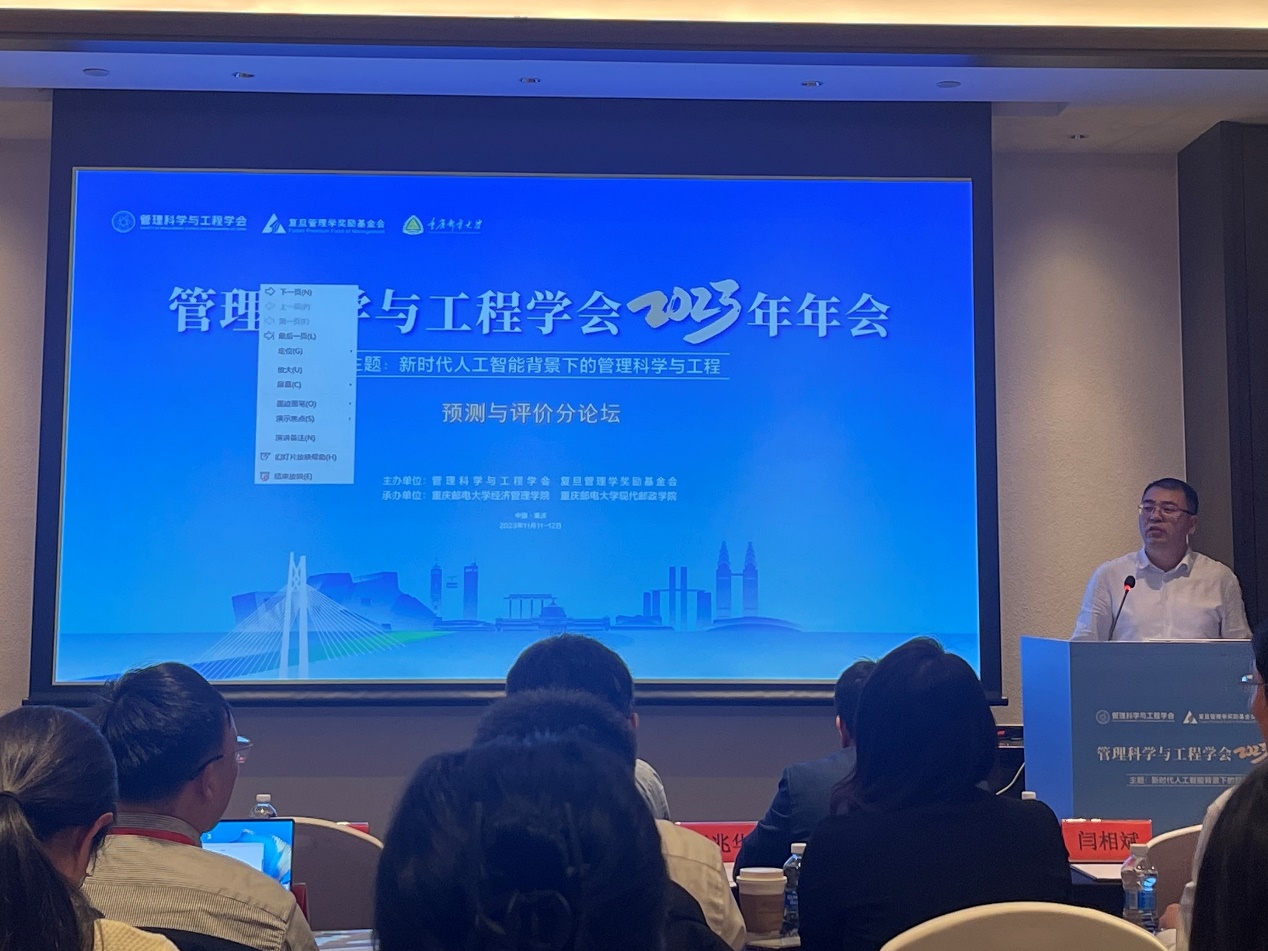 2023年11月11日至12日,管理科学与工程学会2023年年会在重庆召开。会议由管理科学与工程学会、复旦管理学奖励基金会主办,重庆邮电大学cgpay钱包下载 和现代邮政cgpay钱包下载 承办。会议以“新时代人工智能背景下的管理科学与工程”为主题,共有来自清华大学、中国科cgpay钱包下载 大学、复旦大学、北京交通大学等近200所高校、科研院所的1600余名专家学者和师生参加。会议设有工程管理分论坛、大数据与商务分析分论坛、预测与评价分论坛、智能决策分论坛、管理科学与工程应用分论坛、质量与可靠性管理分论坛、协同创新与管理分论坛、供应链与运营管理分论坛等8个分论坛,其中预测与评价分论坛由我院负责承办。