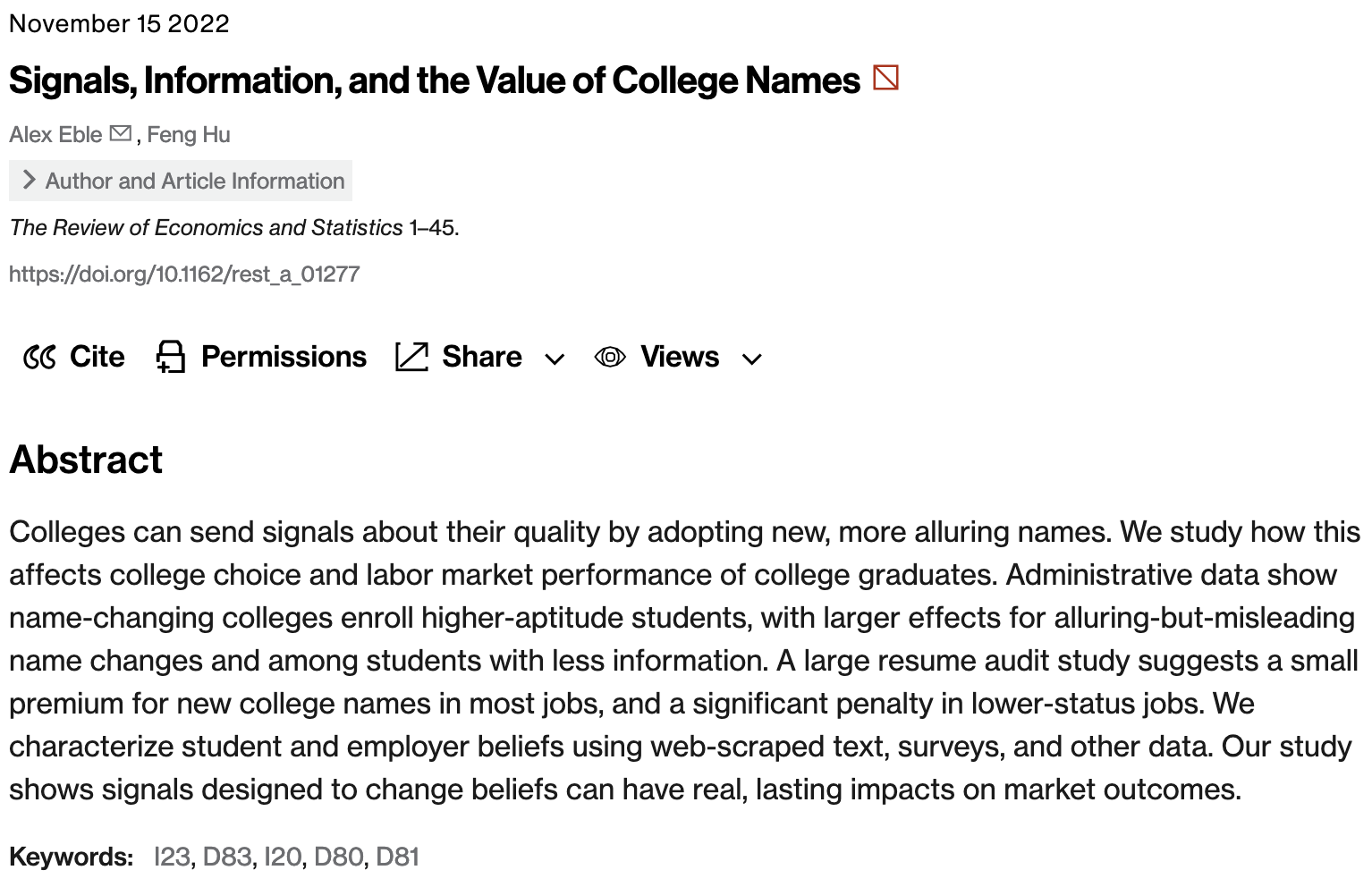 中国的大学更名是人们所关注的热点话题,因为大学更名往往伴随着高考招生分数的上涨和学校声誉的提高。该论文基于中国各大学历年高考招生分数以及知乎上对大学更名的讨论文本的分析,发现大学更名显著提高了大学的高考招生分数,而且这种影响对于外省考生和名字迷惑性大的大学更名来说尤其大。该论文进一步利用简历实验方法和1万多份简历数据发现,对于大多数工作岗位而言,大学更名对大学毕业生获得下一轮面试机会有正向的影响,但对技能要求低的工作岗位来说却有显著的负向影响,这可能是由于毕业生“水平过高”(overqualify)的结果。上述结果在对人力资源部门的相关调查中也得到了印证。