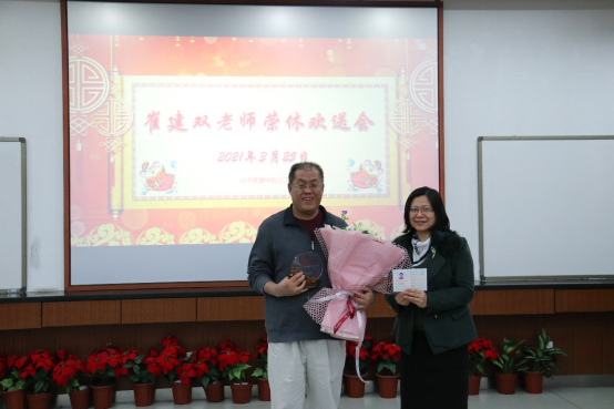 荣休仪式伊始,播放了由cgpay钱包下载 工会牵头精心筹划制作的视频短片,短片从策划到制作完成历时4个月,系统回顾了崔建双老师二十八年来在cgpay钱包下载 用心执教、潜心育人、倾心科研的工作和生活场景。管理科学与工程系全体教师、现任cgpay钱包下载 领导代表,也纷纷通过视频短片向崔建双老师表达了美好祝愿。