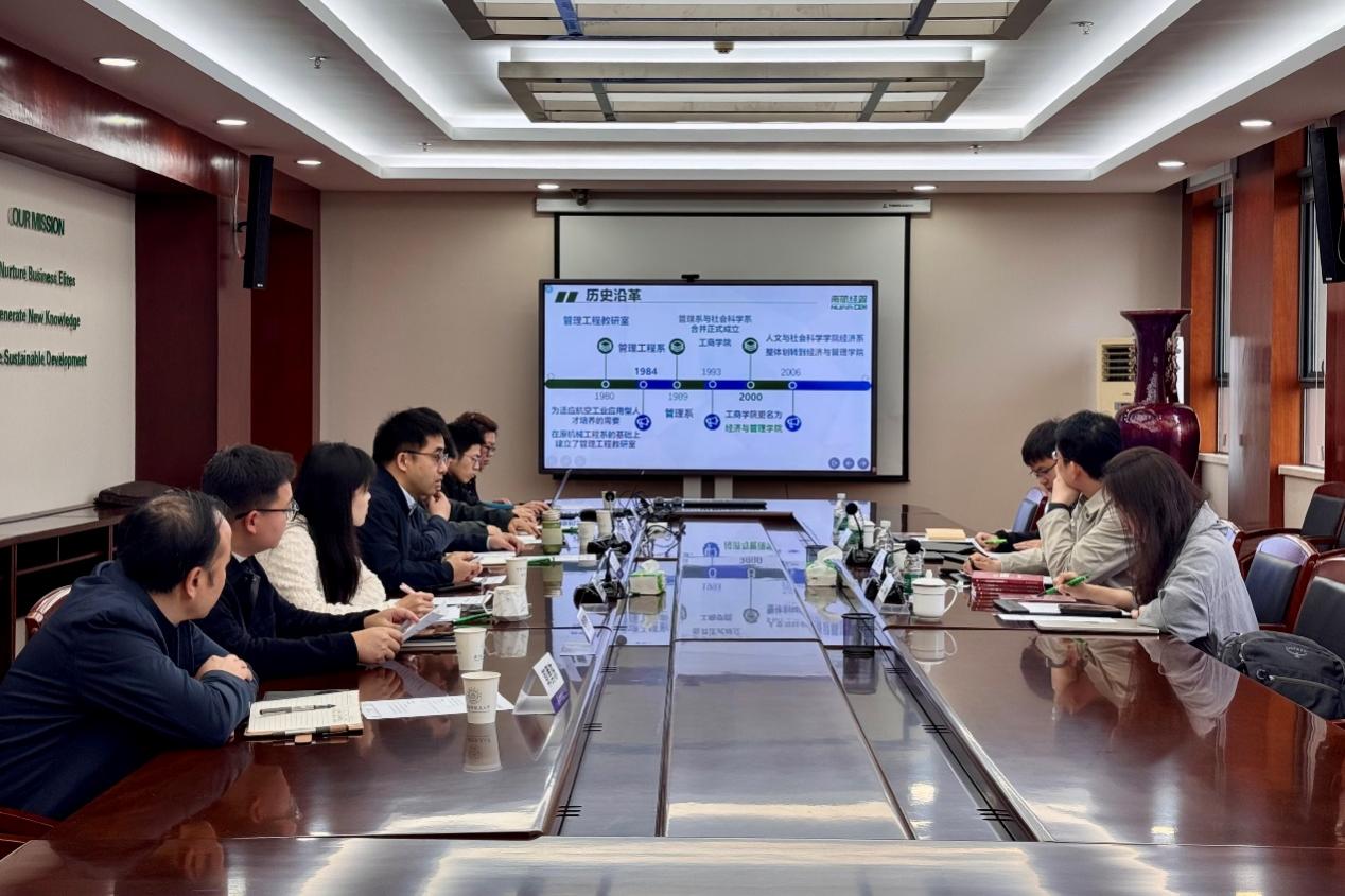 2026年4月22日上午,cgpay钱包下载 院长谷炜一行4人赴南京航空航天大学经济与管理cgpay钱包下载 开展调研。南京航空航天大学经济与管理cgpay钱包下载 院长王群伟,副院长谢乃明、查冬兰、欧阳林寒,管理科学与工程系主任陈剑、副主任黄周春以及实验信息中心主任郭勇陈热情接待。