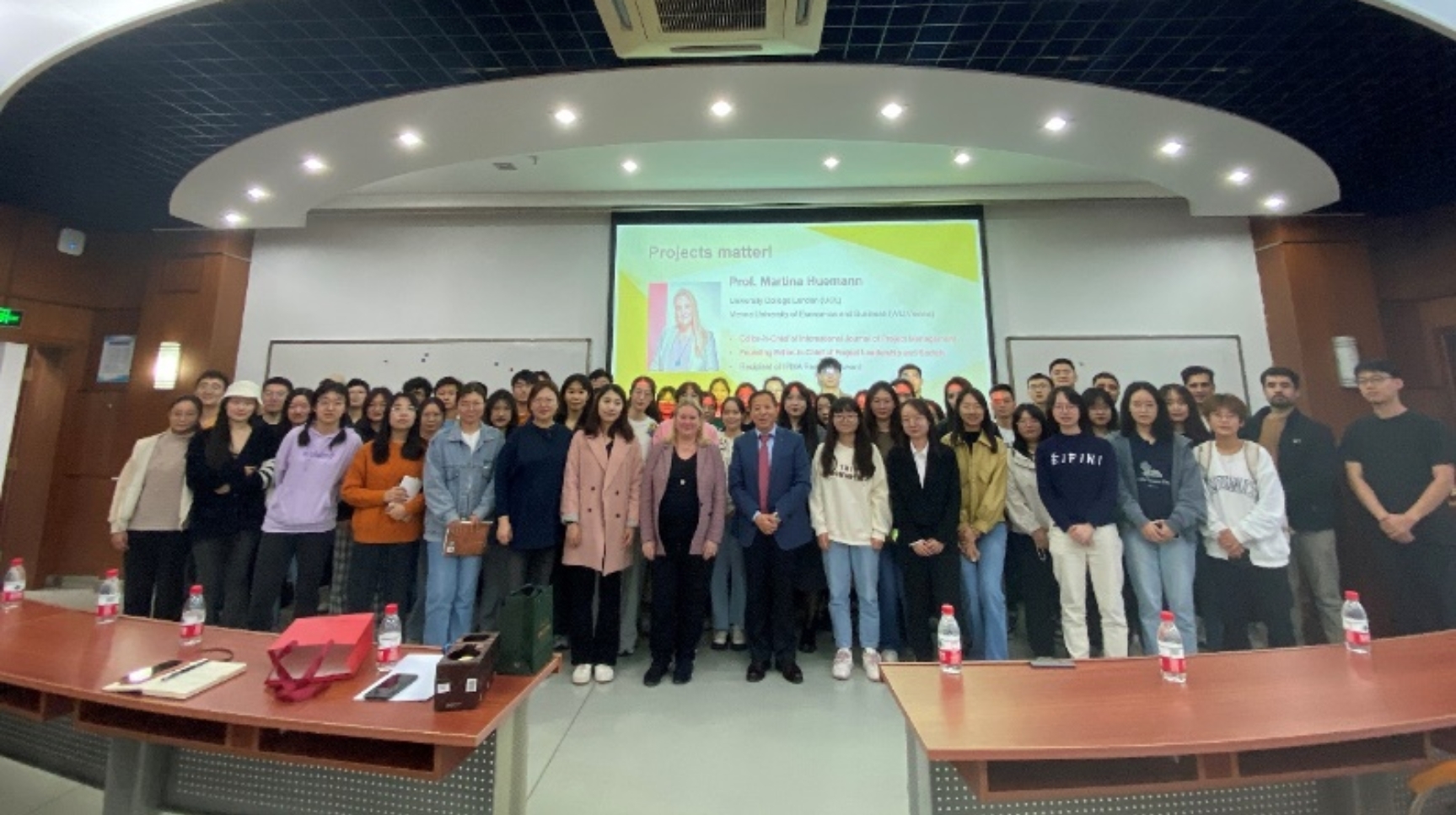313报告厅为近百位学生呈现了以“The Power of Projects”为主题的学术报告,除博士、硕士研究生和本科生外,相关领域的教师和留学生共同参与了本次学术交流。Martina Huemann教授结合自身多年的研究经验以及担任高水平学术期刊主编的经历,分享了她对于项目型社会可持续发展和价值交付的深刻思考,她深入浅出地阐释了项目管理领域的前沿话题,与在场师生共同探讨了这一领域的未来发展方向。此外,Martina Huemann教授还分享了在高水平国际学术期刊发表文章的经验,为参会师生提供了实质性的指导。
