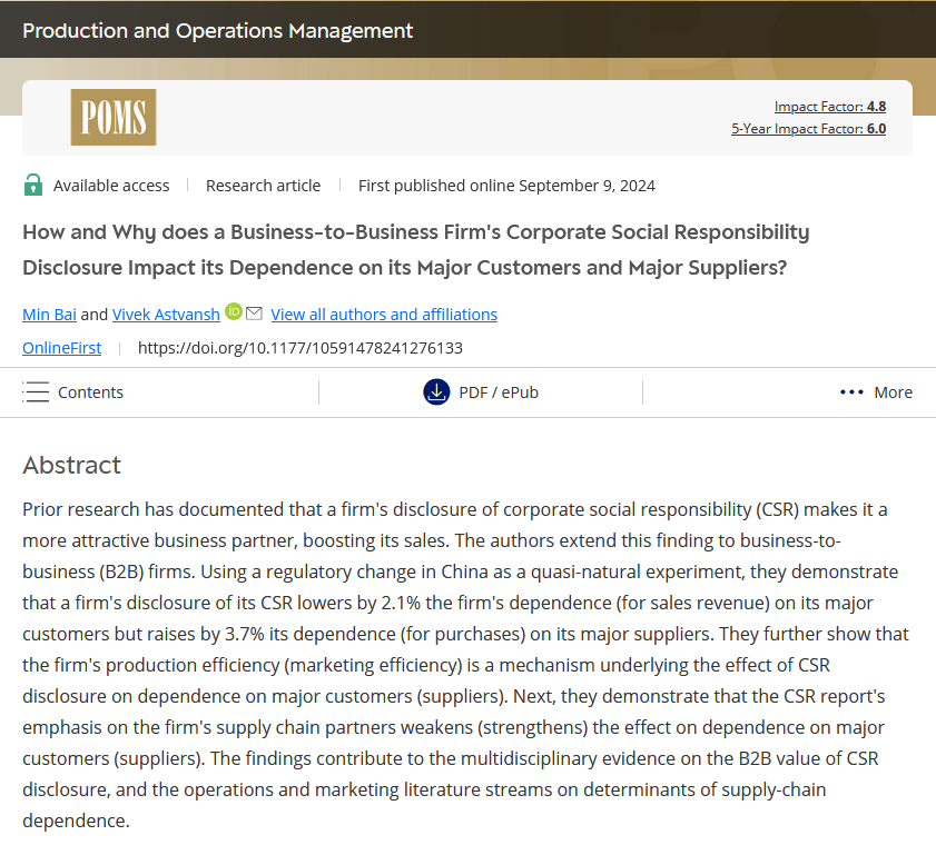 近日,我院应用经济系教师白旻作为论文第一作者,与加拿大麦吉尔大学Vivek Astvansh副教授合作撰写的学术论文《How and why does a Business-to-Business Firm’s Corporate Social Responsibility Disclosure Impact its Dependence on its Major Customers and Major Suppliers?》在UTD24列表期刊Production and Operations Management发表。