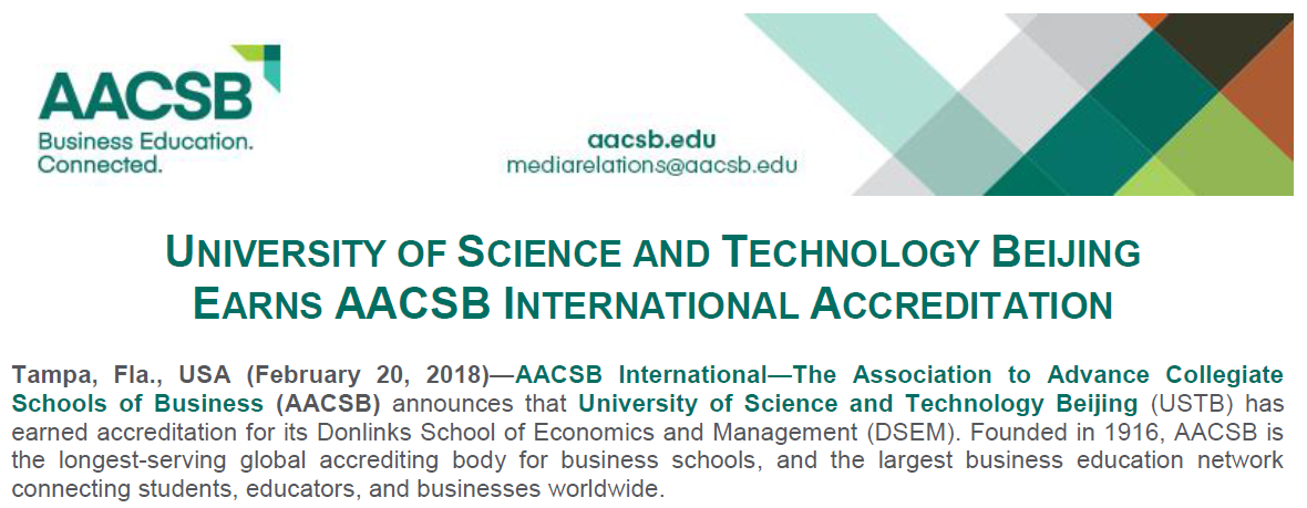 协会(The Association to Advance Collegiate Schools of Business, 简称AACSB)的通知,经过AACSB的初始认证委员会(Initial Accreditation Committee,简称IAC)和理事会(Board of Directors)的决议,我院正式通过AACSB国际认证,认证期限为5年。这标志着北京科技大学成为大陆地区第19家,北京第5家通过AACSB认证的大学。