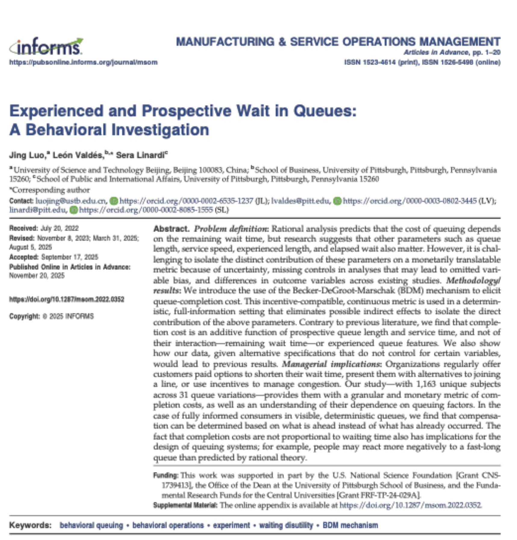 近日,我院管理科学系讲师骆靖作为论文第一作者,与匹兹堡大学副教授León Valdés 和Sera Linardi 合作撰写的学术论文《Experienced and Prospective Wait in Queues: A Behavioral Investigation》在UTD24列表期刊Manufacturing & Service Operations Management(M&SOM)发表。这是我院教师在M&SOM发表的首篇论文。