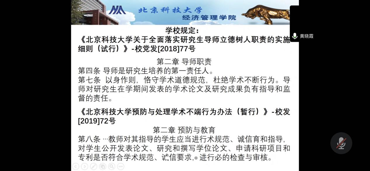 第三场讲座是由黄晓霞教授给研究生导师们作的“导师制与研究生学术道德失范预防”,黄教授从研究生导师的使命与重任讲起,强调了研究生导师在研究生培养教育中第一责任人的重要性,要求cgpay钱包下载 教师以身作则,恪守学术道德规范,杜绝学术不端的行为。