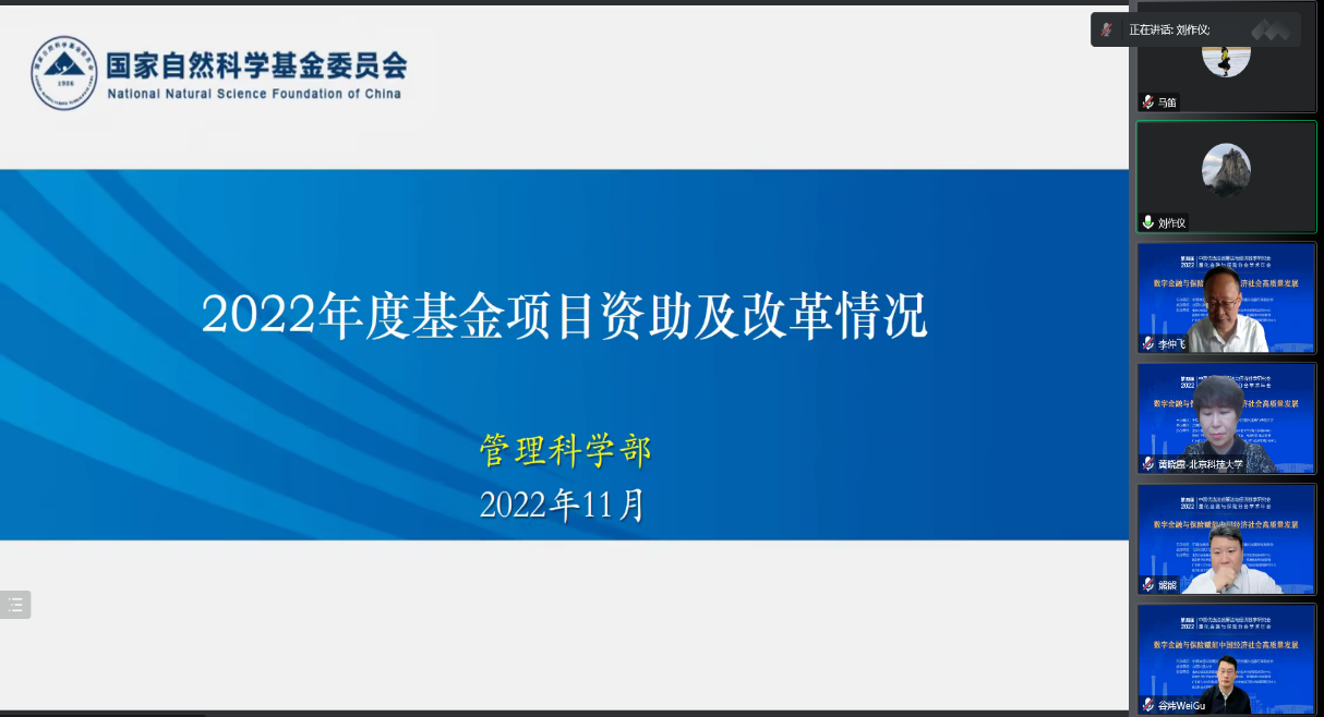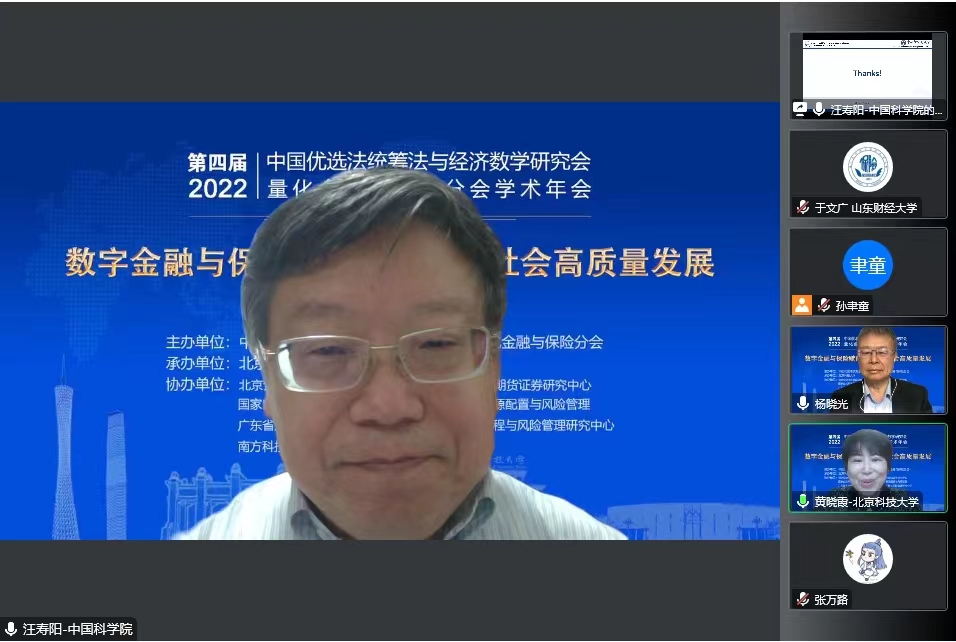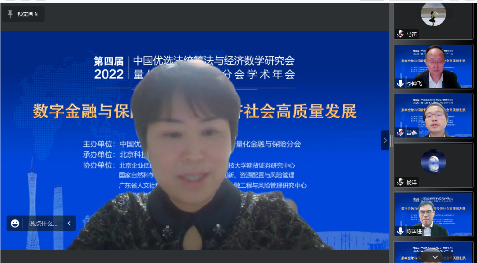 开幕式后,由国家自然科学基金委管理科学部副主任刘作仪、哥伦比亚大学的周迅宇教授、中国科cgpay钱包下载 的汪寿阳院士和中国科cgpay钱包下载 系统科学研究所副所长杨晓光研究员作大会报告。首先,刘作仪主任作了题为《2022年度基金项目资助及改革情况》的大会报告,详细介绍了2022年度管理学部基金资助情况和改革情况。然后,周迅宇教授作了题为《ReinforcementLearninginContinuousTimewithFinancialApplications》的大会报告,介绍了无模型连续时间强化学习及其在金融资产管理中的应用。上半场大会报告由大会主席李仲飞理事长主持。汪寿阳教授作了题为《加密货币的几个问题》的大会报告,从比特币挖矿谈起,通过几个案例来分析数字经济时代风险管理的一些新问题,并针对这些新问题,提出新理论、新方法与新技术,促进数字经济风险管理理论的研究与发展。最后,杨晓光研究员作了题为《数字经济的内在逻辑》的大会报告,报告指出了从卖方经济到买方经济的人类行为的变化,使得互联网和信息技术全面赋能经济各个环节,并阐述了数字经济的经济产出中市场和数据要素的重要性。下半场大会报告由cgpay钱包下载-cgpay钱包官网 副院长黄晓霞教授主持。大会报告内容丰富、精彩纷呈,为参会人员呈现了一场量化金融与保险前沿研究的思想盛宴。大会报告期间通过腾讯会议参与大会报告学习讨论的人数达到了300上限,同时还有近500人通过线上直播的方式参与大会报告的学习。