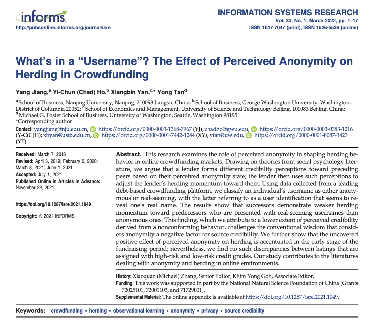 近日,我院管理科学与工程系闫相斌教授的研究成果 What’s in a “username”? The effect of perceived anonymity on herding in crowdfunding 在国际顶级期刊 Information Systems Research 发表。Information Systems Research (ISR)是 INFORMS 旗下期刊、属 UTD24 列表期刊,主要关注组织、机构、经济和社会背景下信息系统的理论及研究,是国际管理科学界公认的最高级别期刊之一。这是闫相斌教授近期在该期刊发表的第2篇学术论文,对cgpay钱包下载 管理科学与工程学科的建设具有重要意义。
