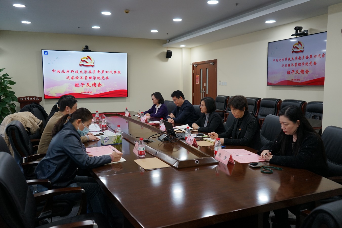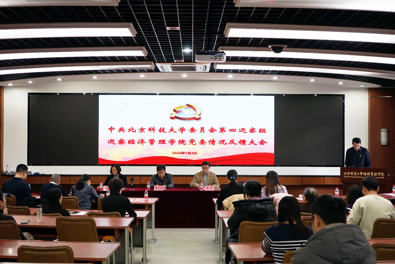 1月2日下午,中共北京科技大学委员会第四巡察组巡察cgpay钱包下载 党委情况反馈大会在经管楼313顺利召开。校党委副书记、纪委书记张大林,第四巡察组组长蒋韬,副组长刘淑红、副组长王斌,巡察工作办公室主任张俊燕,巡察组和巡察办的相关同志,cgpay钱包下载 党委领导班子成员及师生代表参加了大会。会议由cgpay钱包下载 院长谷炜主持。