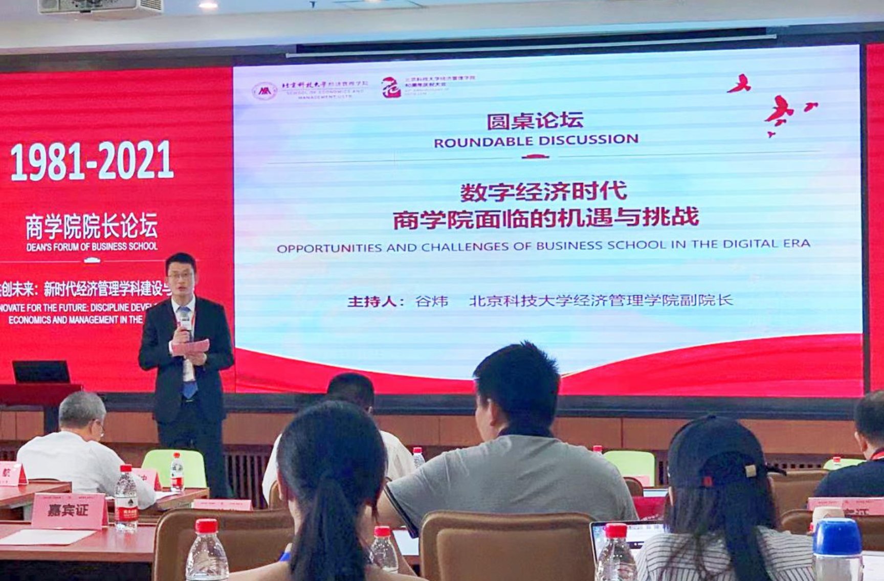 本次院长论坛的最后一个环节是圆桌讨论,主题为“数字经济时代商cgpay钱包下载 面临的机遇与挑战”,由cgpay钱包下载-cgpay钱包官网 副院长谷炜主持,北京邮电大学cgpay钱包下载 院长王欢、南京财经大学信息工程cgpay钱包下载 院长曹杰、北京工商大学商cgpay钱包下载 院长毛新述和北京信息科技大学cgpay钱包下载 院长曲立参与。四位院长分别基于本cgpay钱包下载 的特色介绍了新时代下面临的困难,并表示虽然困难不一,但应对策略有共同之处,从新专业建设、原有专业强化等方面介绍了商cgpay钱包下载 的学科建设之路。